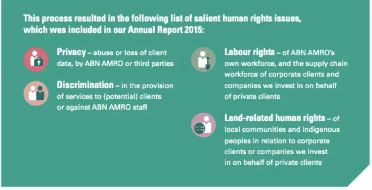 | ABN AMRO | Keuangan | Hak Privasi Diskriminasi Hak kerja Hak tanah | ABN AMRO Human Rights Report 2016 |