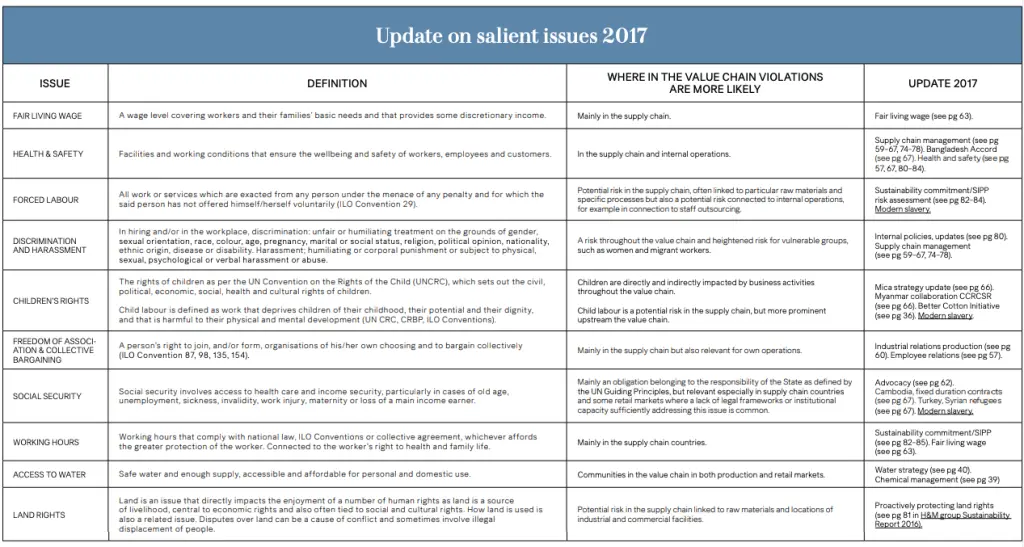 | H&M | Ritel Pakaian | Upah hidup yang adil Kesehatan dan keselamatan Kerja paksa Diskriminasi dan pelecehan Pekerja anak Kebebasan berserikat dan berunding bersama Keamanan sosial Hak atas tanah Jam kerja Akses ke air | Sustainability and Corporate Responsibility Report 2017 |