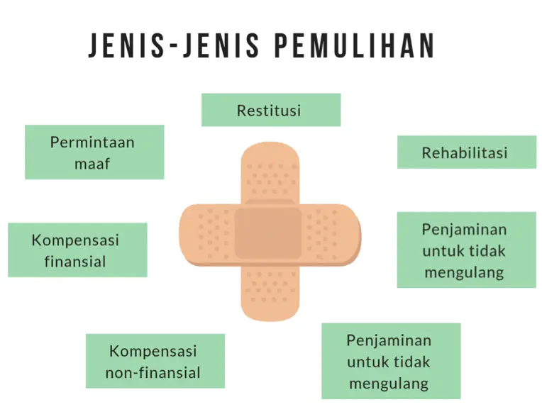 Pemulihan dapat termasuk permintaan maaf, restitusi, rehabilitasi, kompensasi finansial atau non-finansial dan sanksi hukuman (baik pidana atau administratif, seperti denda), serta pencegahan dari kerugian melalui penjaminan untuk tidak diulangi