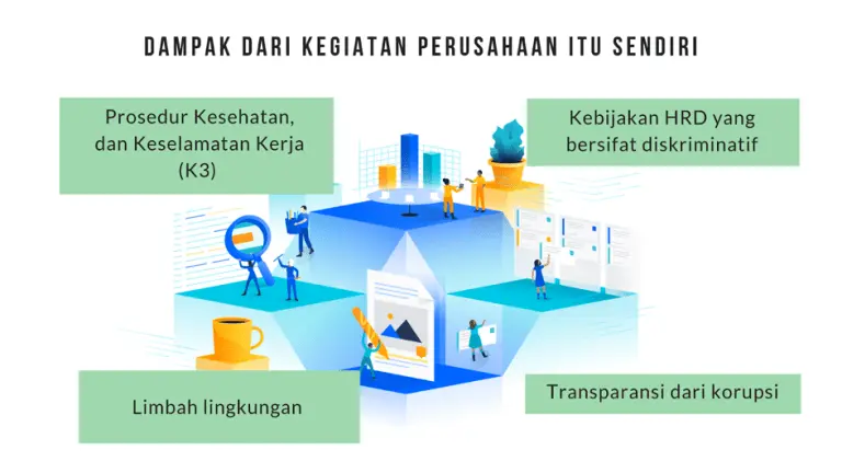 - Kegiatan perusahaan itu sendiriSaat mengidentifikasi akibat negatif apa yang dapat ditimbulkan perusahaan, maka situasi yang paling jelas adalah tanggung jawab perusahaan atas kegiatan mereka sendiri.Contohnya, jika sebuah perusahaan membahayakan para pekerja karena tidak mempunyai prosedur keselamatan yang cukup di tempat kerja, maka perusahaan bertanggung jawab untuk memperbaiki situasi tersebut. Sama halnya dengan perusahaan tidak boleh diskriminatif dalam perekrutan tenaga kerja mereka pada aspek- aspek yang tidak relevan dengan pekerjaan tersebut.