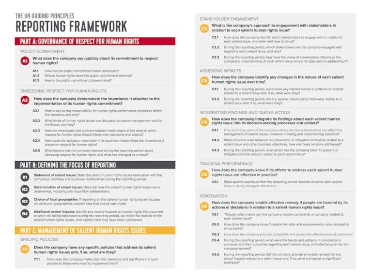 Prinsip-Prinsip Panduan Bisnis dan HAM PBB mendorong perusahaan dengan risiko dampak HAM untuk melaporkan secara resmi upaya penanggulangan dampak HAM perusahaan. Semakin banyak perusahaan berusaha untuk memperkuat pelaporan mereka menggunakan Kerangka Pelaporan Prinsip Panduan PBB yang merupakan inisiatif gabungan dari Shift dan Mazars.
