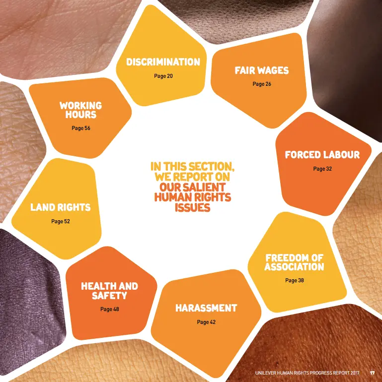 Sejalan dengan kerangka kerja, laporan memprioritaskan kedelapan isu HAM yang menonjol. Unilever memilih kedelapan isu melalui asesmen internal dan lokakarya lintas divisi. Daftar awal ini kemudian diuji dengan berbagai pemangku kepentingan ahli untuk memastikan kekuatan analisis. Daftar masalah yang diprioritaskan tidak hanya menyediakan titik awal untuk pelaporan, tetapi juga untuk manajemen risiko HAM Unilever.